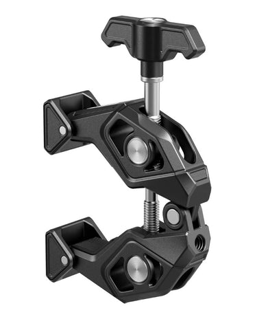 Clamps designed for photography are a perfect, adaptable fit for mounting the Eviction Pad to chairs, tables, etc. while traveling. The company Smallrig makes many affordable versions, and styles. 1/4-20 thread pitch is standard across the photography industry.