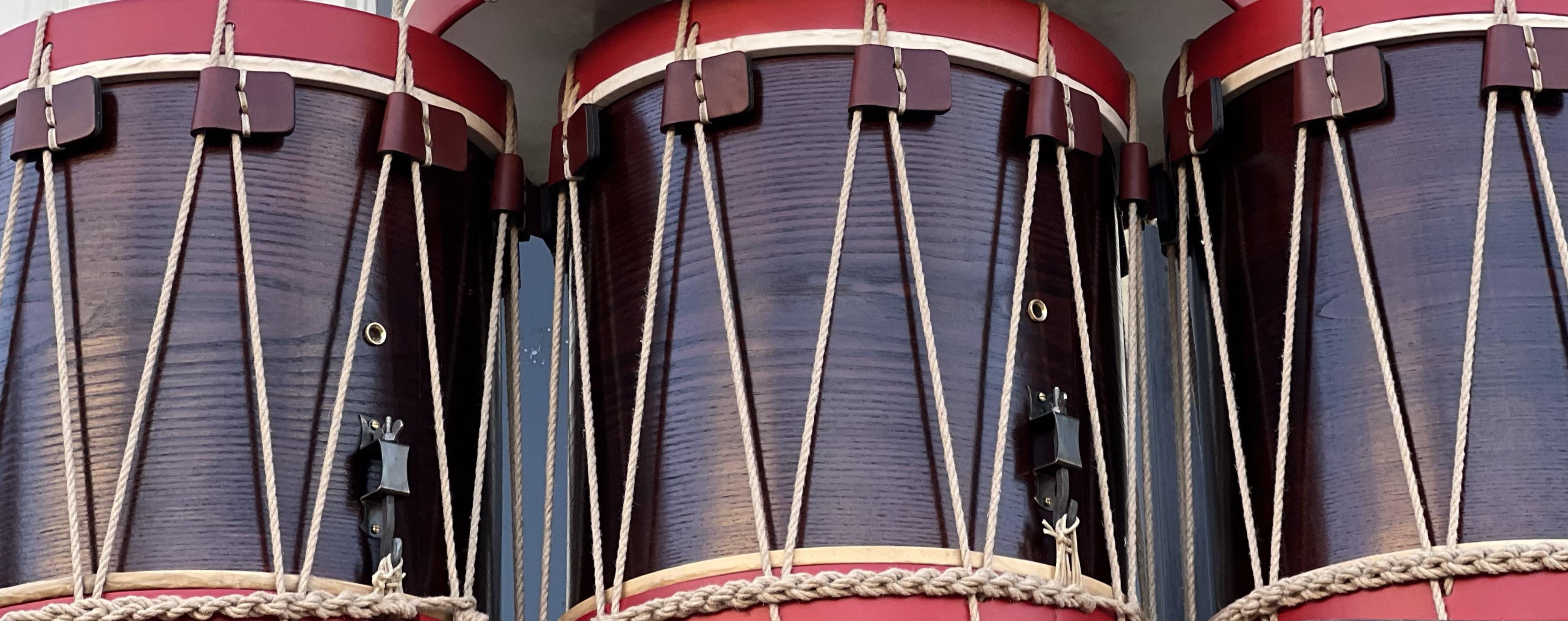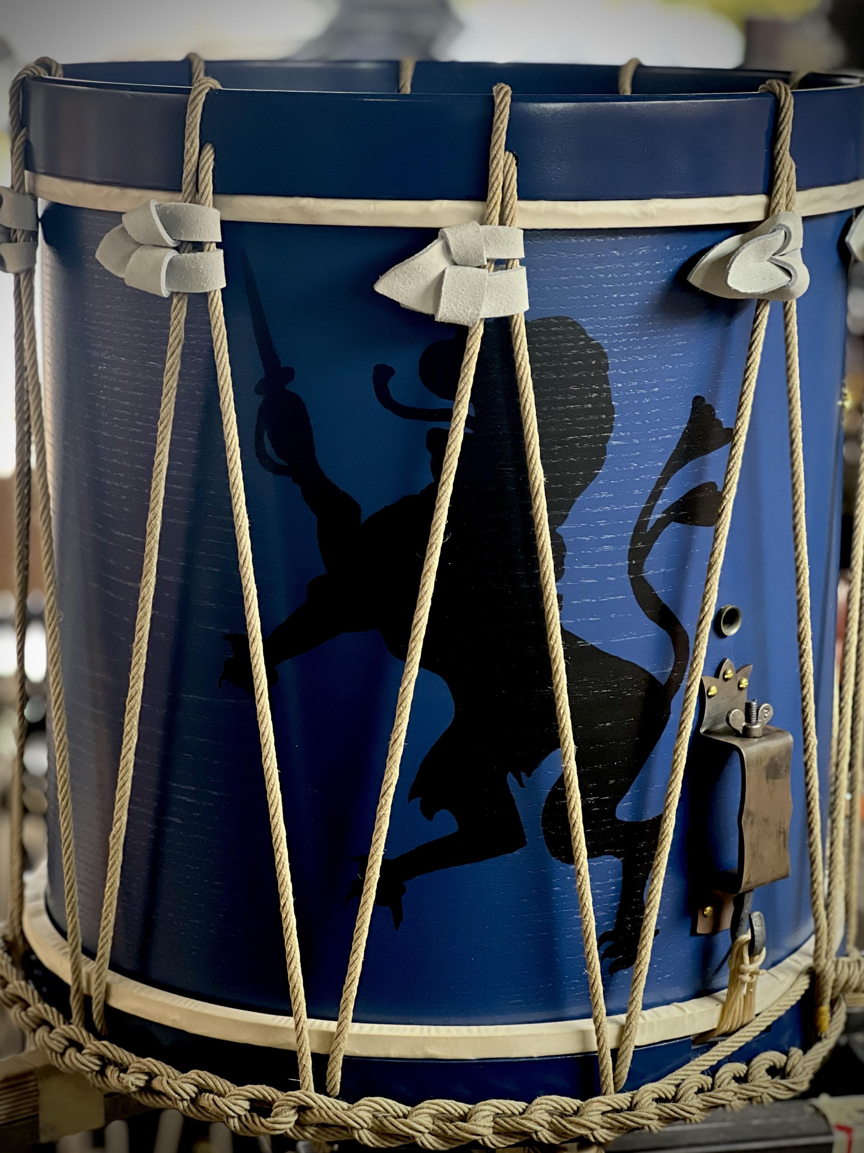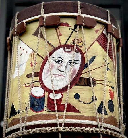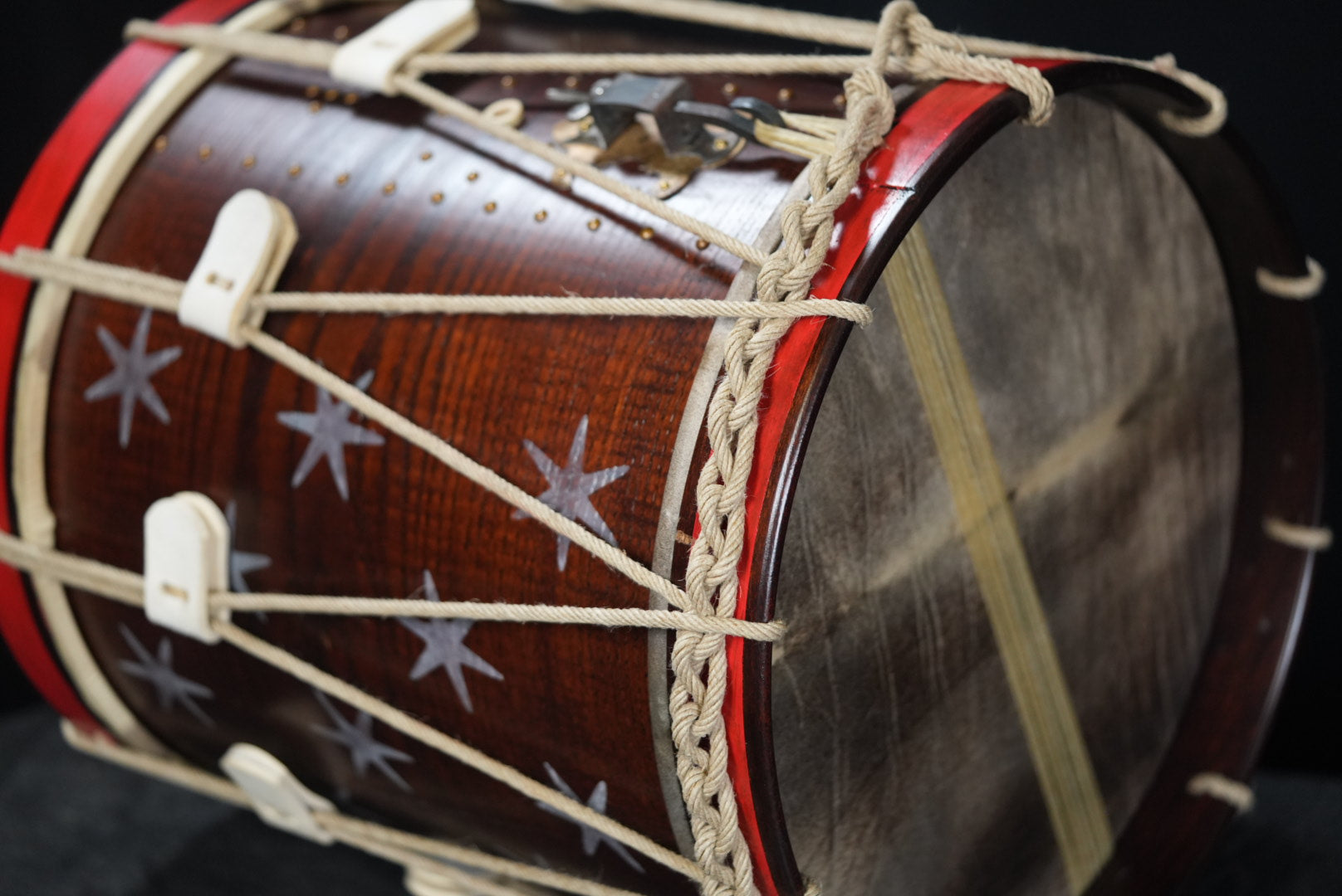 These drums are designed with the look and feel of period-correct instruments but offer a higher standard than most original instruments. Our 18th century style drums have a refined bearing edge and stronger adhesives with more durable paints as options to your preferences. Custom art is available, including hand-painting on the shell or a replica tack pattern.